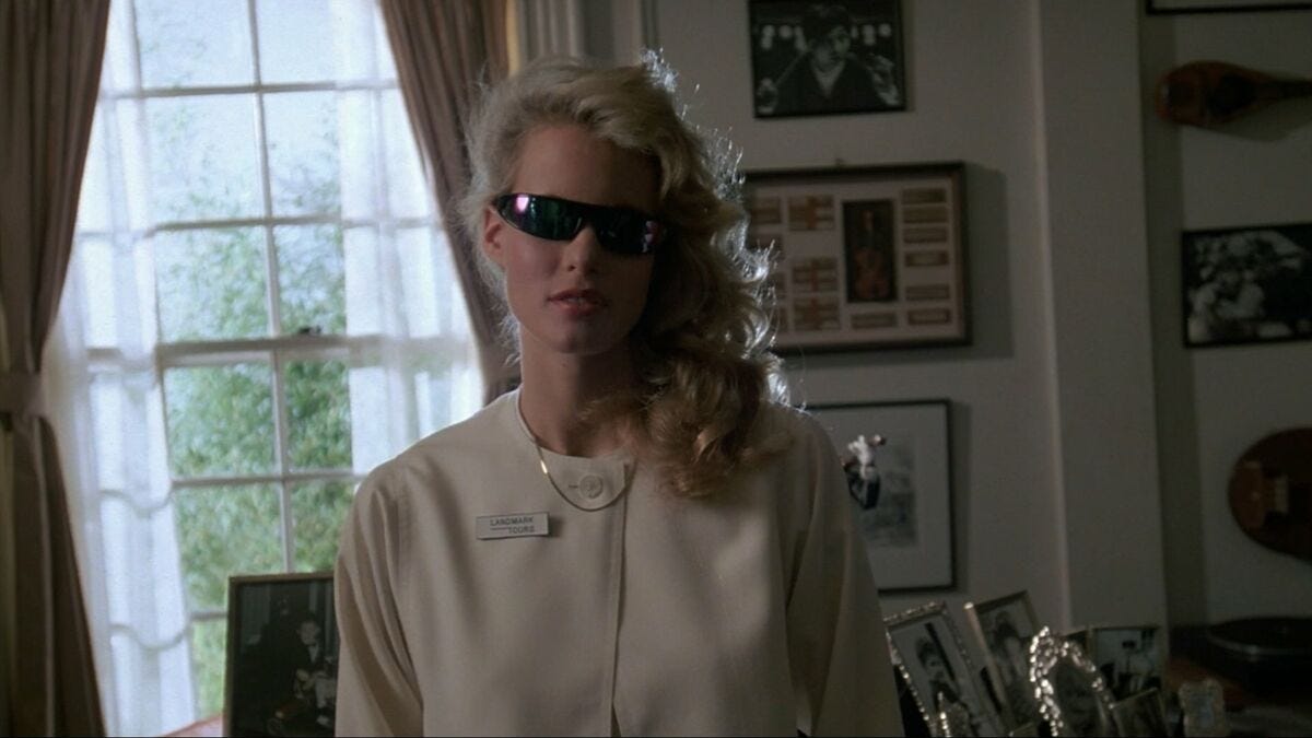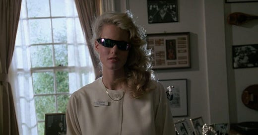 It does, however, feature two genuine 80s female icons in Lori Singer and Carrie Fisher. Singer, you might recall, was the Girl in Footloose who wasn’t permitted to dance and straddled the two pickup trucks on the highway. In this movie, she wears wraparound shades and is styled like Dale Bozzio of the band Missing Persons or a woman from a Nagel print. Fisher, of course, was our reigning Princess, just a few years after Return of the Jedi. She shows up here in a set of leopard-print lingerie that put her famous metal bikini in Jedi to shame. It was a lot for this boy to handle.